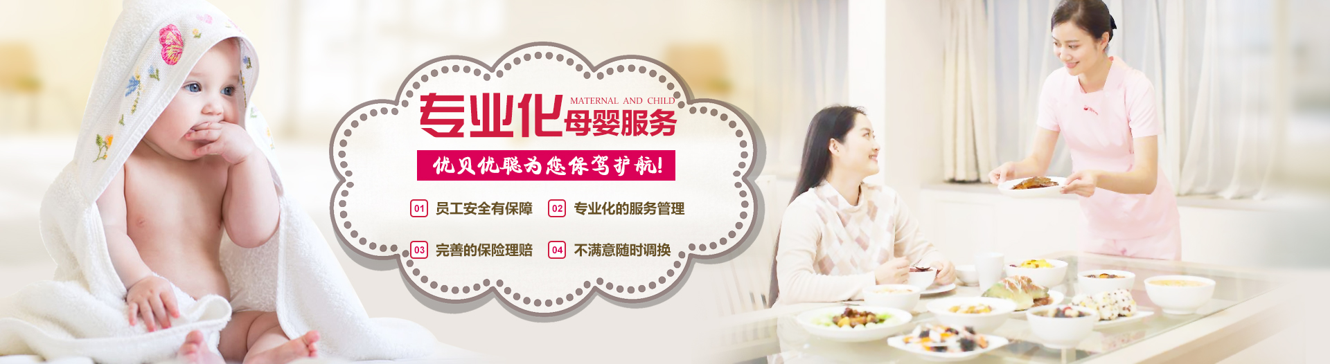 01專業(yè)化的服務(wù)與管理我們專心,專注在母嬰護(hù)理服務(wù)行業(yè)發(fā)展日日益完臻的今天,我們?yōu)榱俗非笠再|(zhì)量取勝于市場,公司對所有員工都經(jīng)過了嚴(yán)格的選拔及精細(xì)的專業(yè)培訓(xùn)和人性化的管理